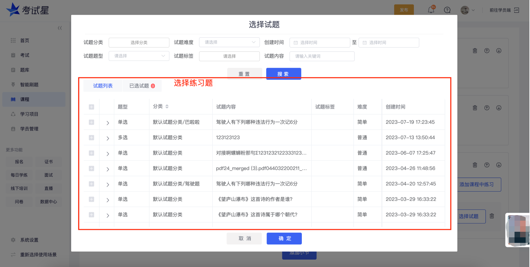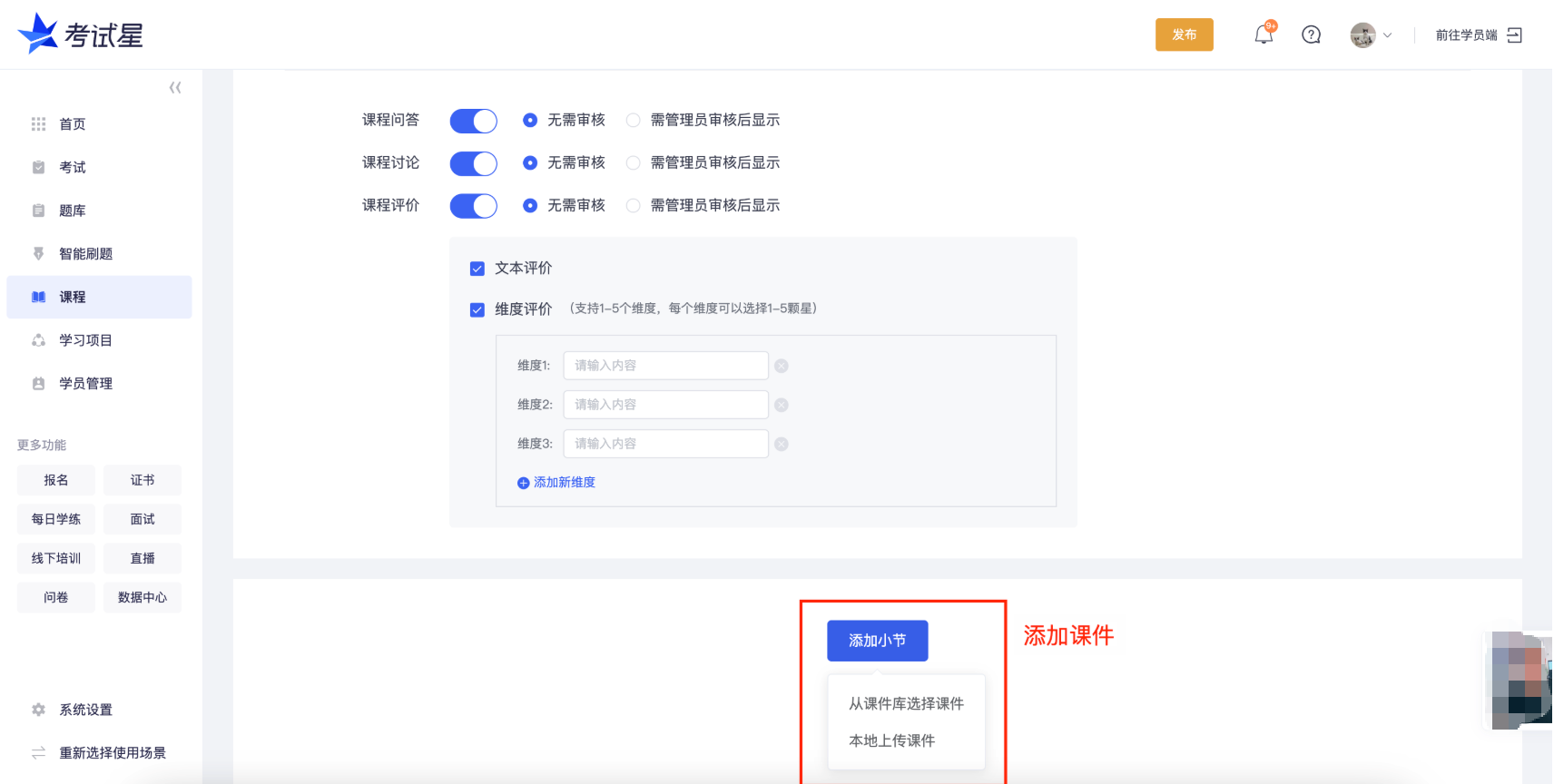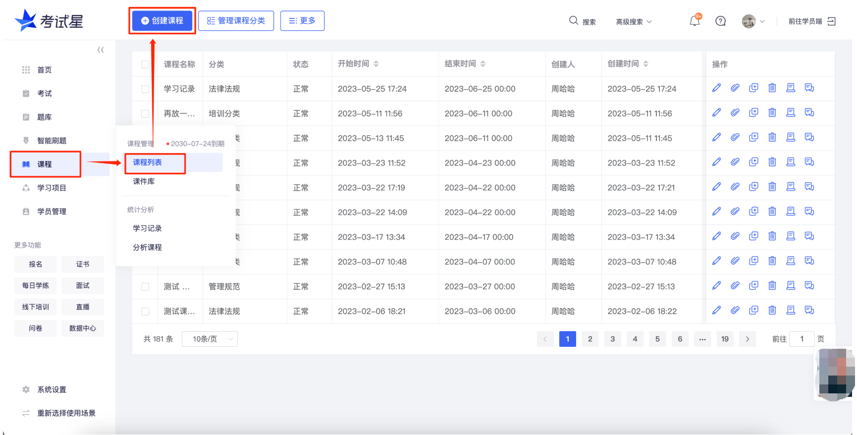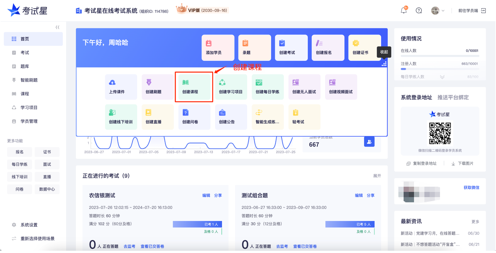 1.进入考试星管理端首页,点击“创建课程”快捷入口,可直接进入创建课程页面;
