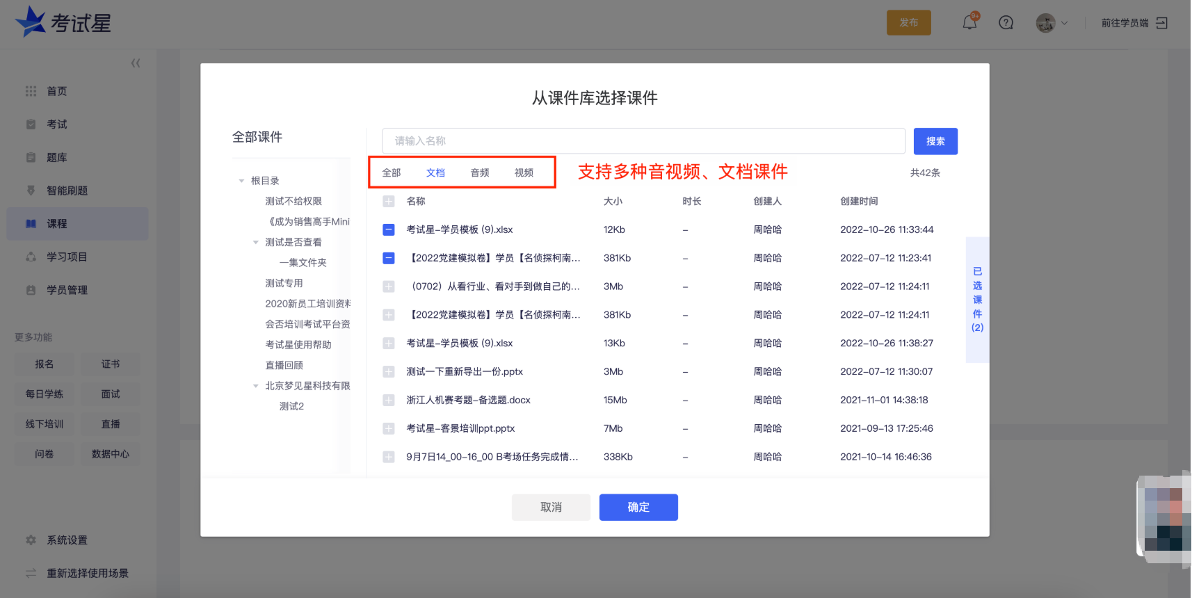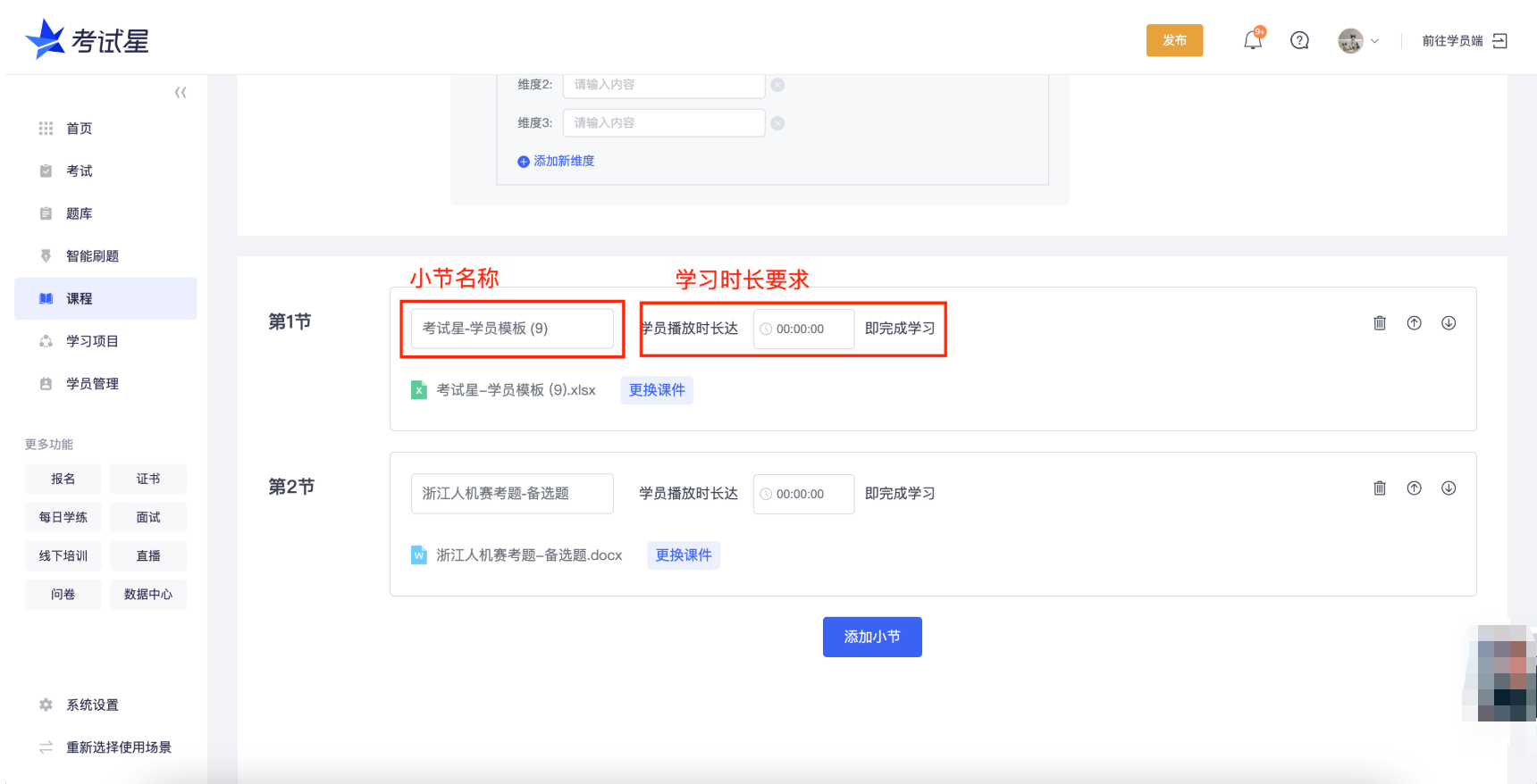 4.添加课件后可进行编辑课件名称,设置学员完成时长,存在多个课间时支持上下移动顺序;