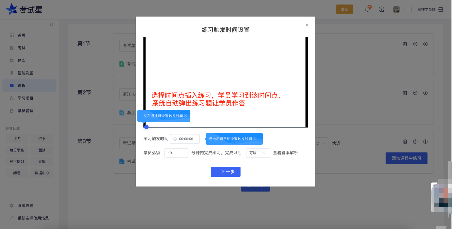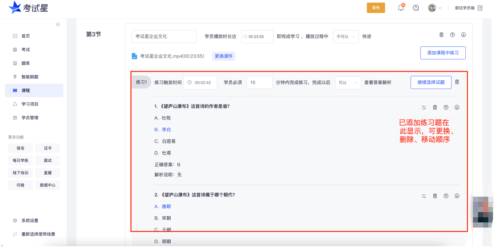 5.音视频文件可设置 学员是否可以快进,可为课程添加练习;