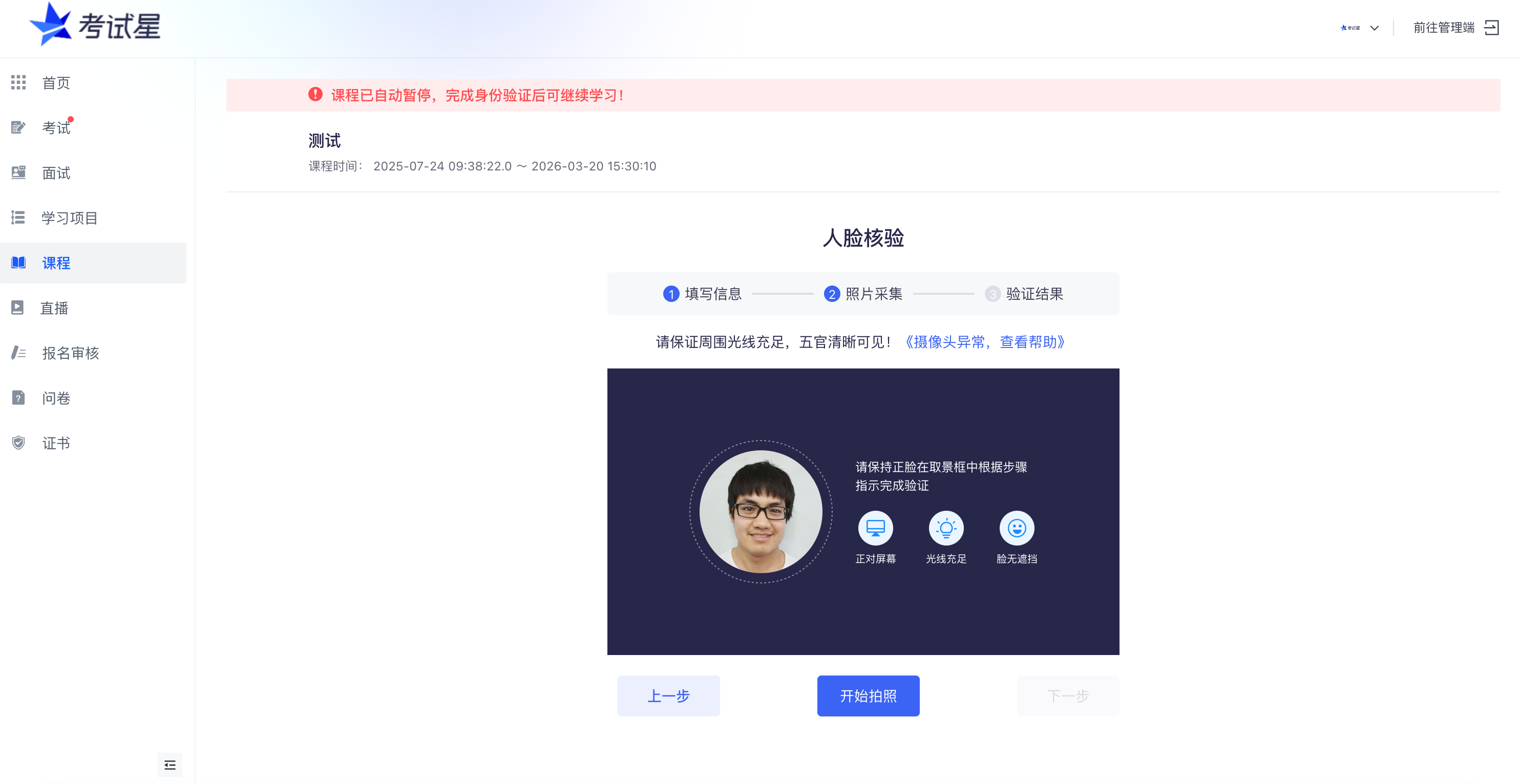 3)学习过程中会根据设定的时间周期,随机抓拍并验证学员身份