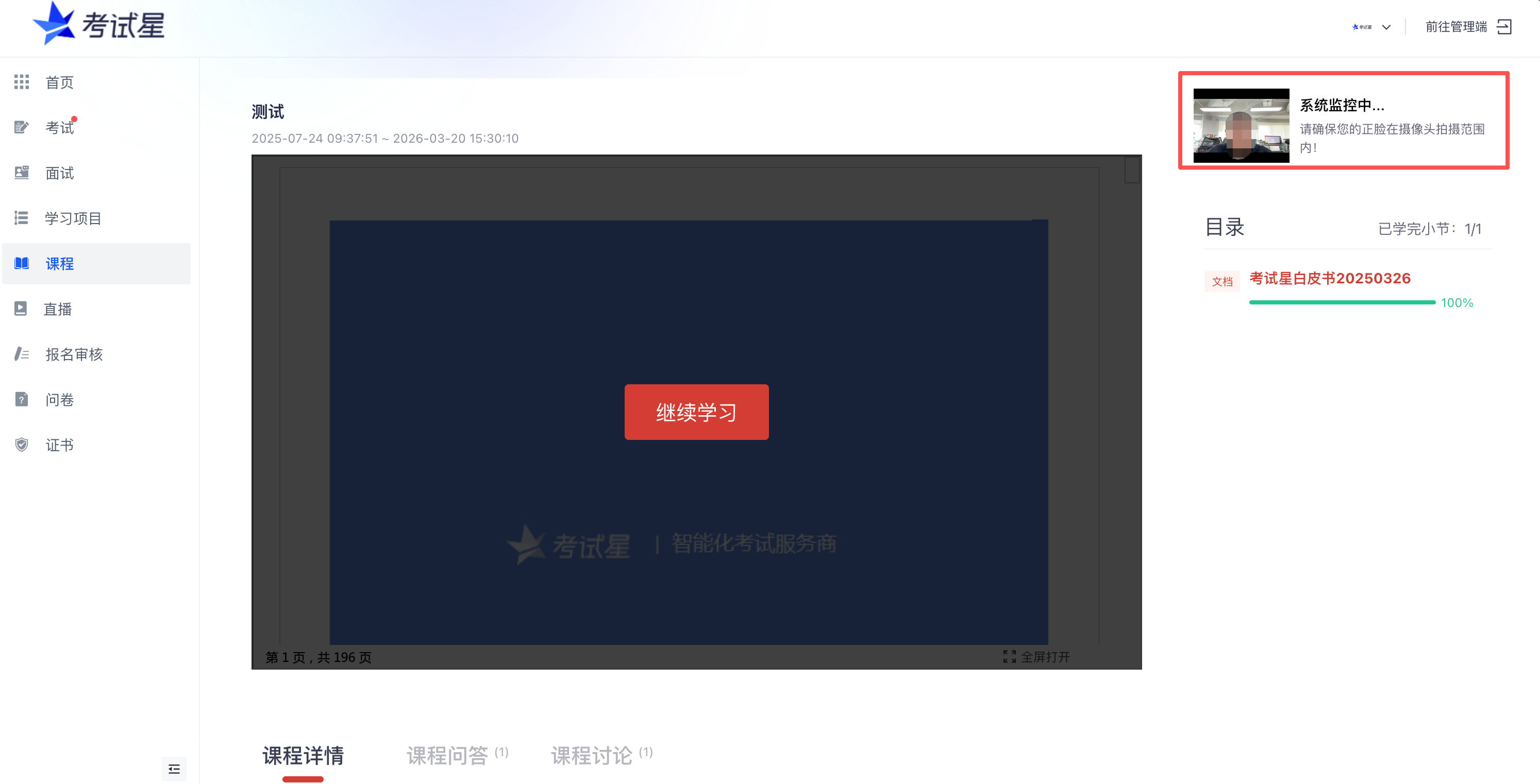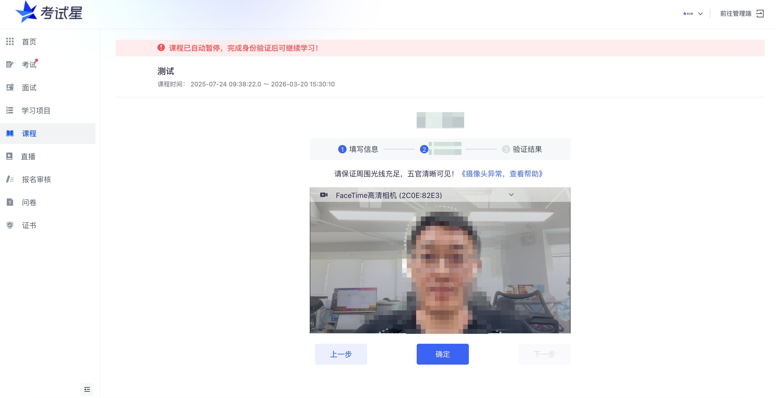 学习过程监控,在课程学习过程中支持做身份核验证机制,有效杜绝挂机、替学等问题